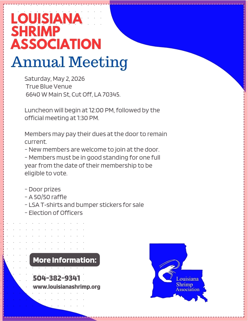 The Louisiana Shrimp Association will host the Annual Members Meeting on Saturday, May 2, 2026, at the True Blue Venue located at 16640 W Main St, Cut Off, LA 70345.
